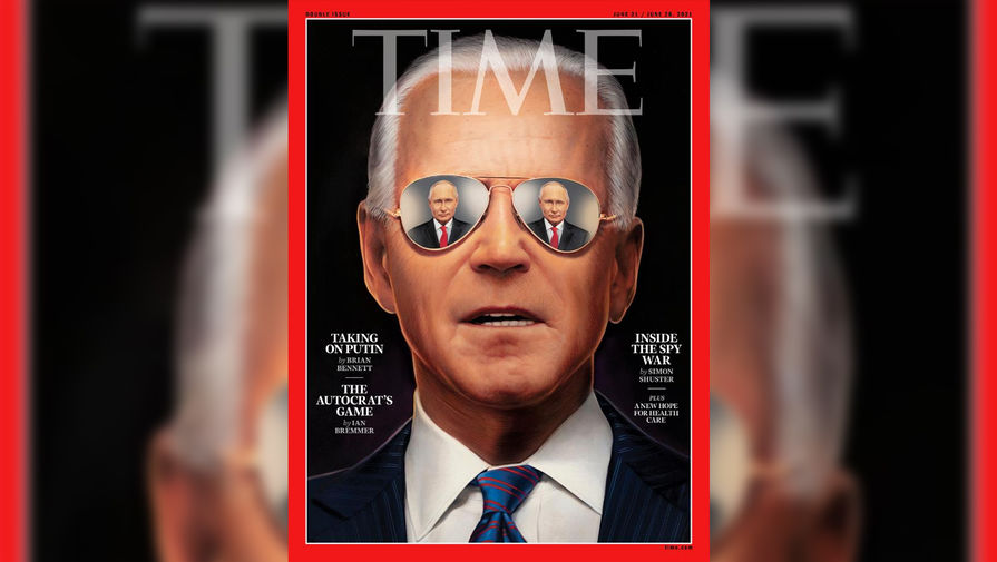 Журнал Time накануне саммита президентов России и США вышел с изображениями Владимира Путина и Джо Байдена на обложке. Путин отражается в солнцезащитных очках Байдена.