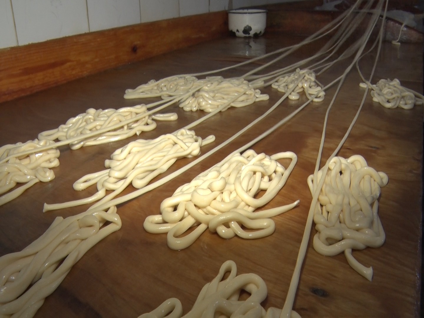 — После подготовки теста мы начинаем его растягивать. Этот процесс имеет свои особенности. Лапшу нужно растягивать равномерно, чтобы она не была слишком тонкой, но и не толстой.
