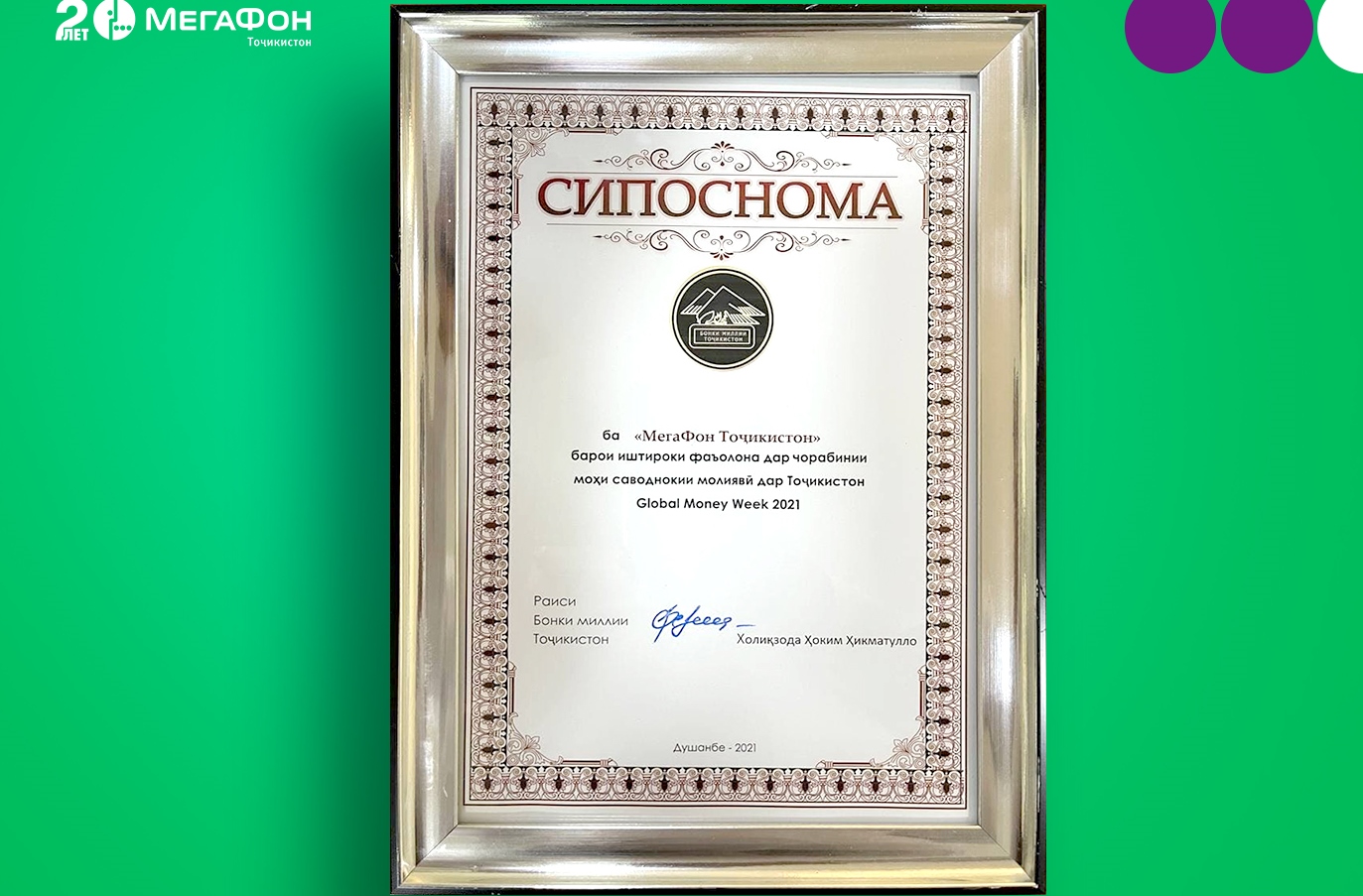 МегаФон Таджикистан получил благодарственное письмо от Национального Банка Таджикистана за поддержку месяца финансовой грамотности Global Money Week в 2021 году. Благодаря участию Digital-партнера проект стал по-настоящему массовым: только творческий конкурс для детей и молодежи охватил в соцсетях свыше 1 000 000 пользователей.