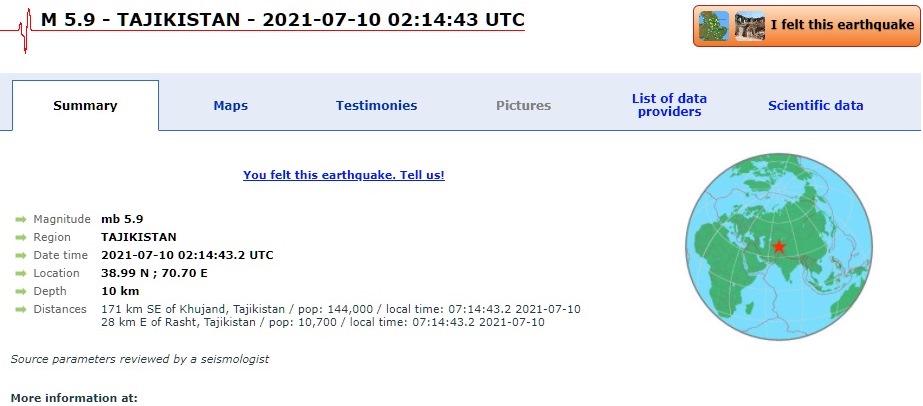 По данным EMSC, эпицентр располагался в 171 км к юго-востоку от города Худжанд. Очаг залегал на глубине 10 км.