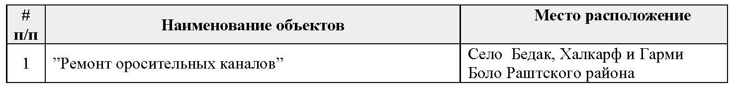 Программа поддержки развития обществ горных регионов (ППРОГР) — проект Фонда Ага Хана/Таджикистан — при финансовой поддержке Швейцарского Агентства по развитию и сотрудничеству (SDC) в рамках проекта «Интегрированный подход к улучшению здоровья и среды обитания» в Раштской долине приглашает всех заинтересованных, правомочных лиц подать заявки в запечатанных конвертах на выполнение следующих строительно-ремонтных работ: