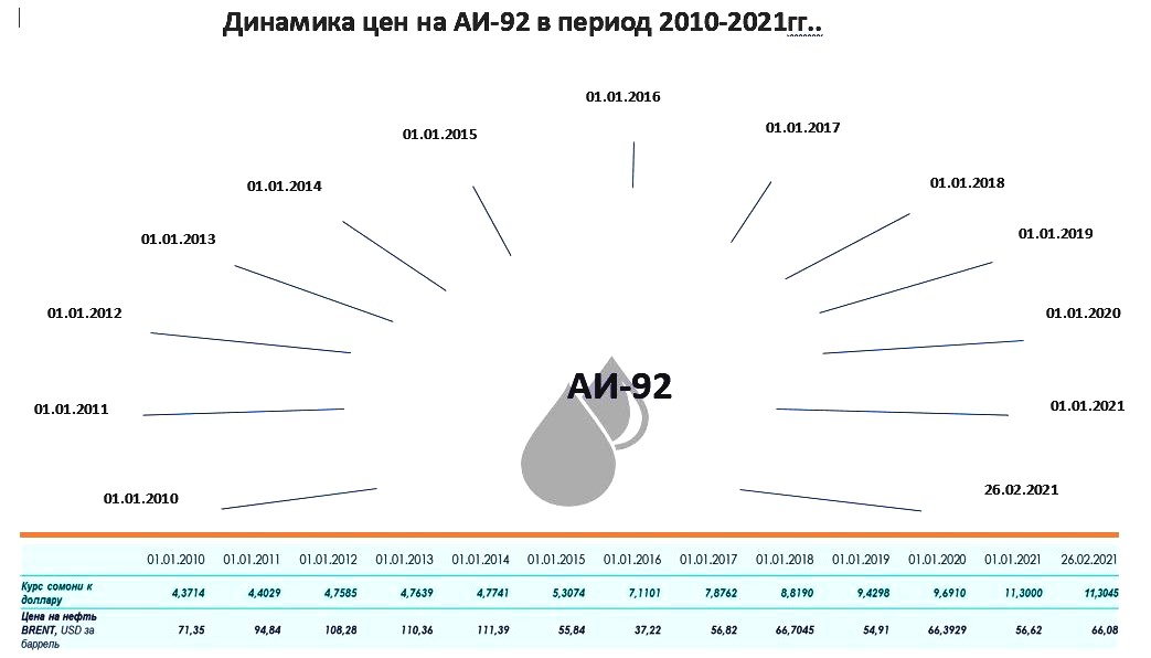 Статистические данные на 2010-2021 свидетельствуют о том, что розничные цены на горючие материалы в сомони за данный период поднялись в 2 раза, но в пересчете на доллары, наоборот, снизились. Приводим розничные цены на 1 литр бензина на 1 января 2010г. и начало марта 2021 г.: АИ-92 – $0,77 и $0,66, АИ-95 – $0,84 и $0,69, АИ-98 – $1,1 и $0,73.