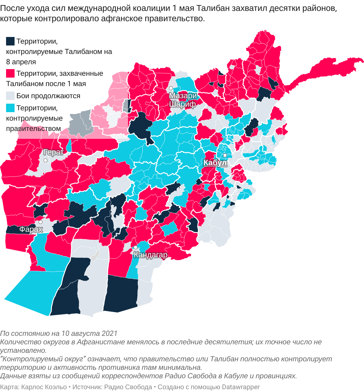 Талибы ранее заявляли о контроле над столицами провинций Кундуз, Сарипул, Тахор, Джаузджан, Саманган, Фарах и Нимруз. В настоящее время ожесточенные бои идут рядом с административными центрами провинций Герат, Балх, Кандагар.