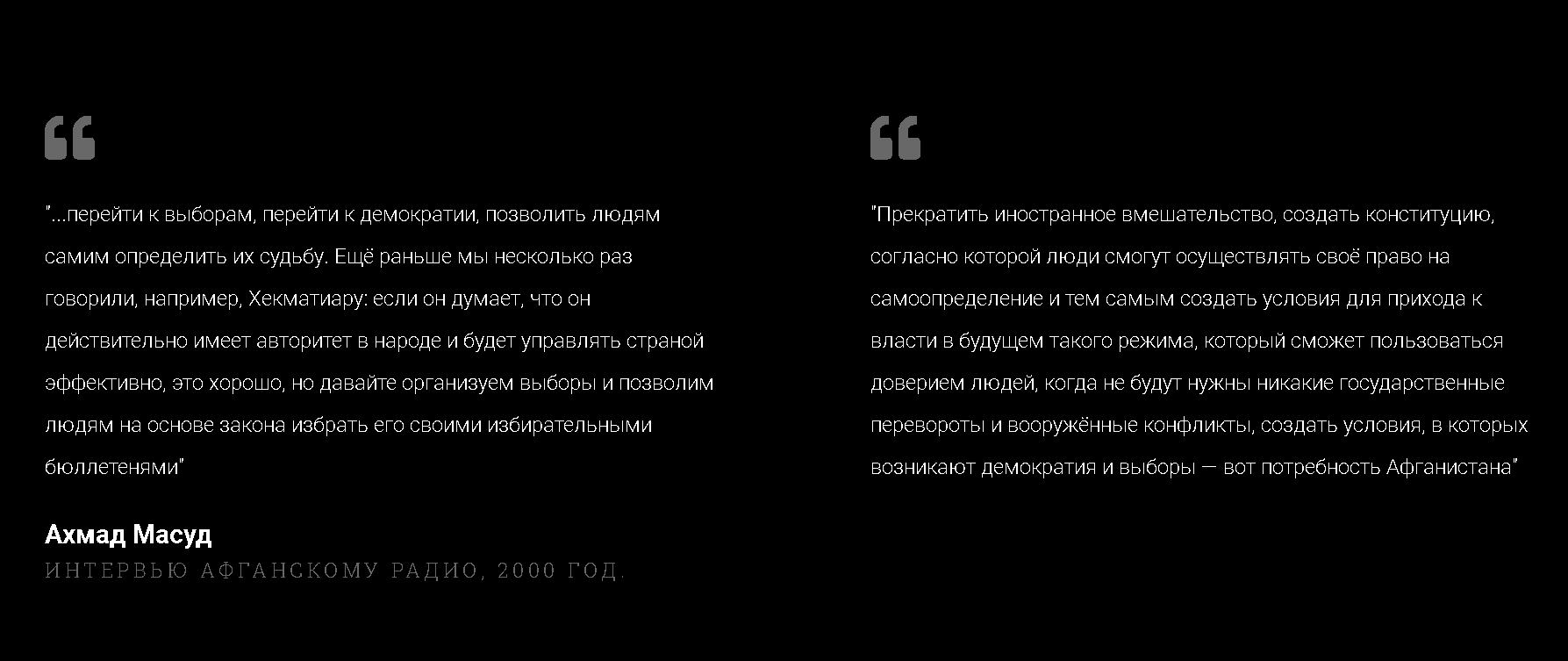 «… за демократию, права человека, права женщин, а также множество прочих ценностей, которых мы смогли добиться за последние два десятилетия. Мы первая линия обороны. Мы защищаем и Европу, и весь регион. Афганцы воюют не только за себя, но и за всех остальных».