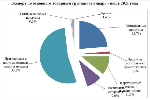 Более половины (53%) в структуре экспорта образовалось за счет вывоза из страны драгоценных и полудрагоценных камней и металлов. Данная продукция экспортирована на сумму $709 млн, что в 2,3 раза больше, чем за аналогичный период прошлого года.