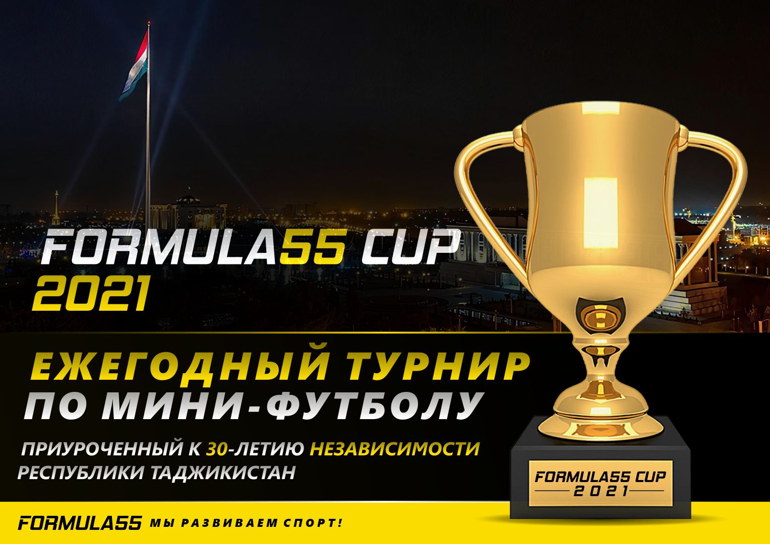 В этом году состоится знаменательный для Таджикистана праздник — 30-летие независимости республики! Именно к этому юбилею компания приурочила ежегодный турнир по мини-футболу «Formula55 Cup» 2021!