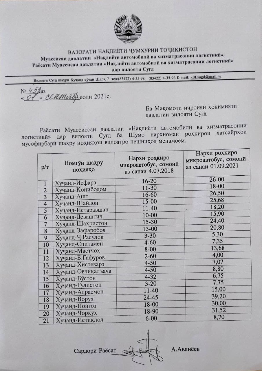 Он сообщил, что было подготовлено официальное обращение к Министерству транспорта и 21 июля, согласно постановлению №125 министра транспорта, были предложены новые расценки на проезд в микроавтобусах по городу и в регионы Согда из Худжанда.