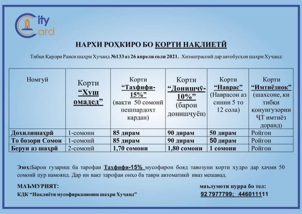 "Теперь проезд в автобусе не будет оплачиваться наличными и будет доступен только по пластиковой карте City Card и Dushanbe City. Уважаемые родители, наступил новый учебный год, ваши дети будут пользоваться City Card с тарифом “Наврас”. Жителей или гостей Согдийской области просим купить карту и ею оплачивать проезд. Это делает оплату более прозрачной, простой и удобной", — такое уведомление выложило на своей странице в Facebook предприятие "Нақлиёти мусофиркашонии шаҳри Хуҷанд".