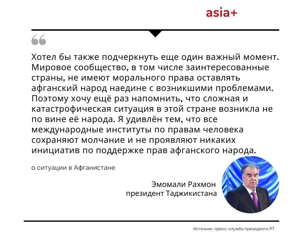 "Не виноваты люди этой страны в такой сложной и катастрофической ситуации. Удивлен тем, что все международные правозащитные учреждения молчат и не выдвигают никаких инициатив в поддержку прав афганского народа", — продолжил Рахмон.