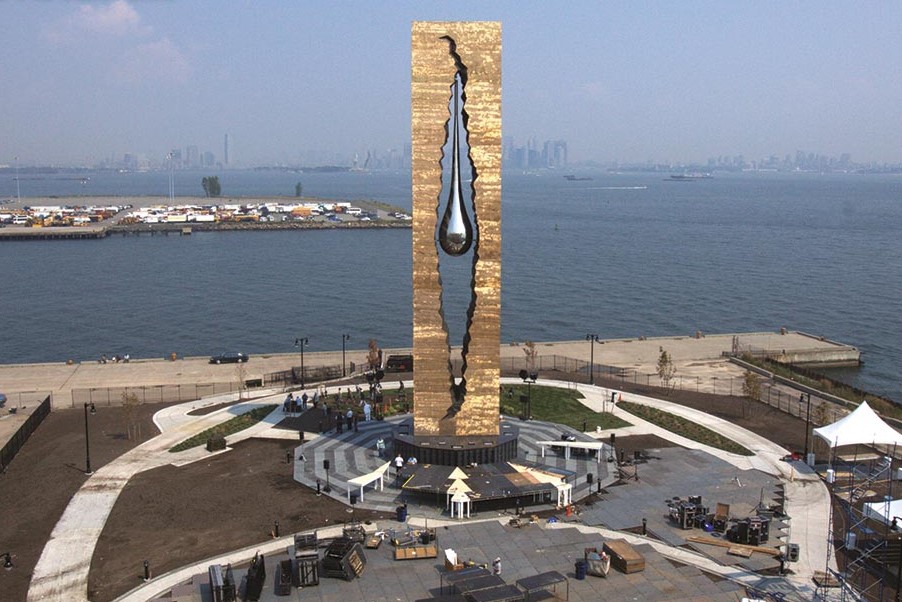 Он представляет собой расколотую бронзовую плиту, символизирующую рухнувшие «башни-близнецы». Внутри трещины подвешена 12-метровая стальная капля – слеза.