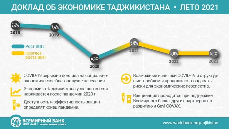 В докладе отмечается, что восстановление экономики в значительной степени зависит от доступности и эффективности вакцин и устойчивости мировой экономики перед лицом новых волн пандемии. «Возможные вспышки COVID-19 и задержки с проведением вакцинации могут привести к новым мерам изоляции и снижению экономической активности в Таджикистане», — подчеркивают аналитики ВБ.
