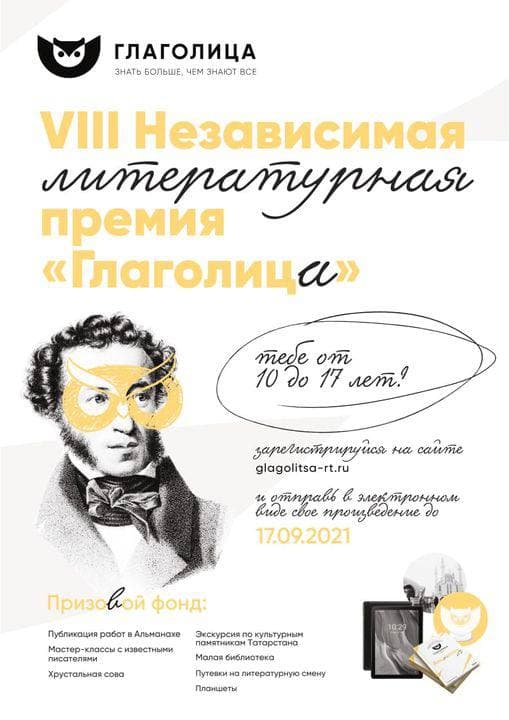 Юные авторы из Таджикистана могут побороться за главный приз премии. “Глаголица” – конкурс для подростков от 10 до 17 лет. Это свобода творчества и самовыражения в любых жанрах и форматах на русском и на татарском языках: поэзии, прозе, эссе, художественных переводах.
