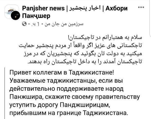 «Уважаемые таджикистанцы, если вы действительно поддерживаете народ Панжшера, скажите своему правительству, пусть впустит панджшеровцев, которые находятся на вашей границе», — просит автора поста.