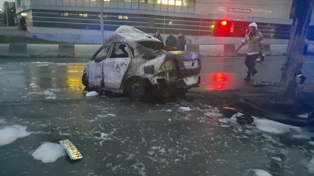 По словам очевидцев, автомобиль ехал на большой скорости, в результате врезался в световую опору. После столкновения закоротили провода.