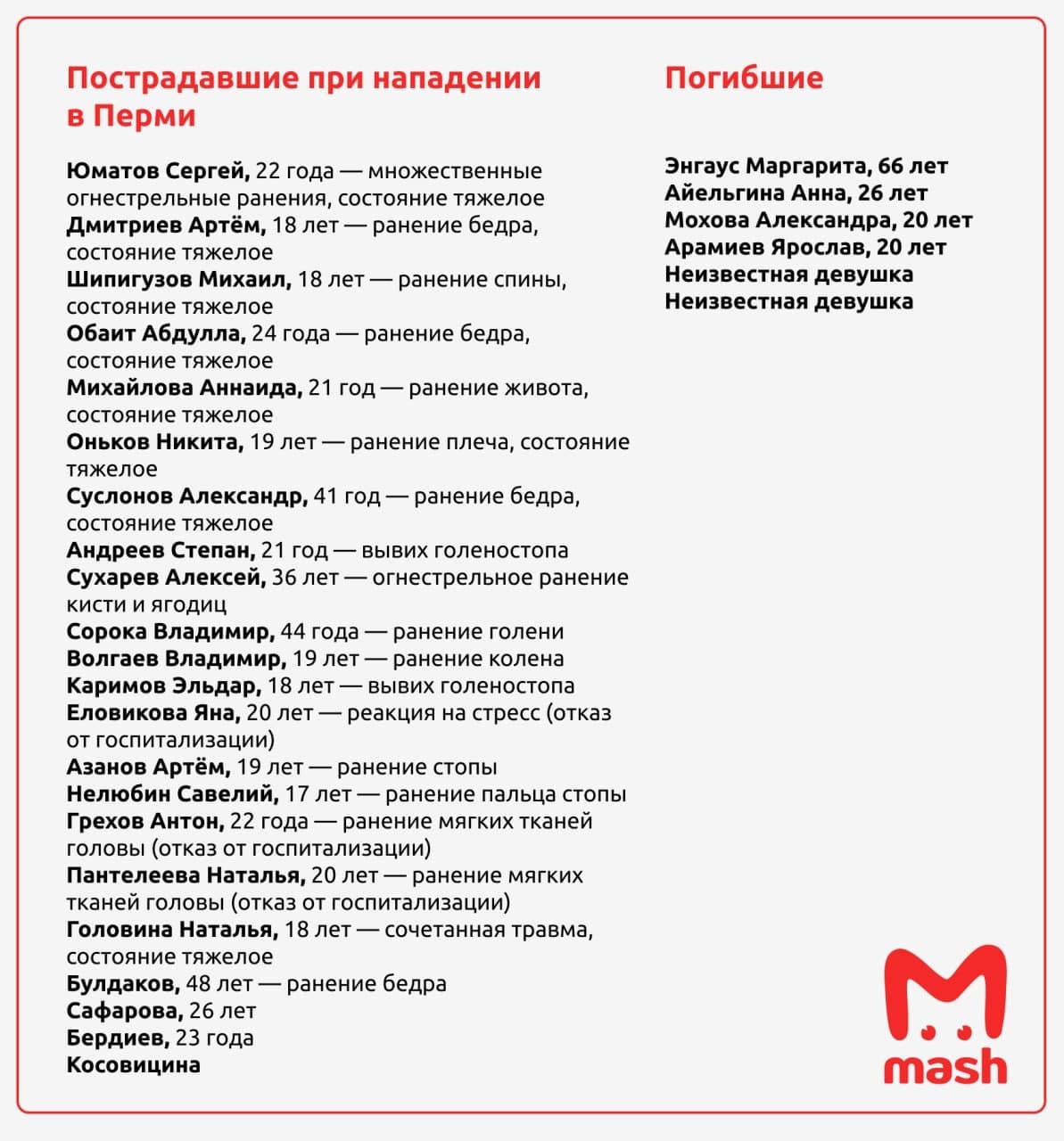 В результате стрельбы погибли восемь человек, пострадали 28, сообщил Следственный комитет. По информации Минздрава, у 19 пациентов огнестрельные ранения. Источник РИА Новости в экстренных службах рассказал, что как минимум один человек находится в тяжелом состоянии.