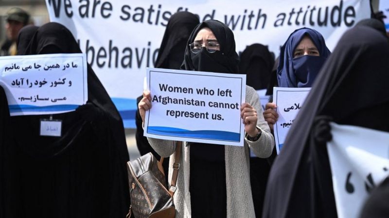 "Женщины, покинувшие Афганистан, не могут нас представлять", — было написано на табличке в руках у одной из участниц демонстрации.