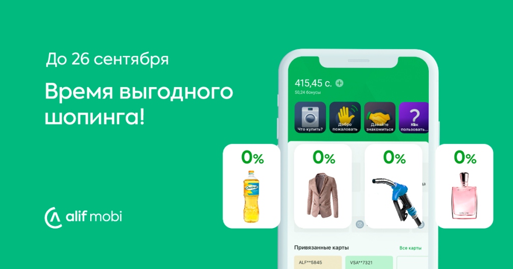 К нам тоже уже тихо-тихо подкрадывается осень, новый сезон — новые бытовые заботы. «Алиф Банк» запустил акцию и увеличил срок беспроцентной рассрочки. Только с 23 по 26 сентября вы можете обновить гардероб всей семье, наполнить холодильник необходимыми продуктами питания, наполнить полный бак автомобиля топливом, купить тот самый парфюм и многое другое в рассрочку от 3 до 9 месяцев без комиссии — 0%.
