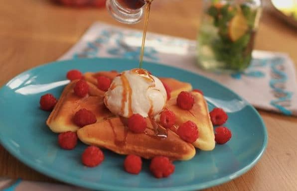 бельгийскими вафлями в сочетании с шариками мороженого, украшенными ягодками (35 сомони)