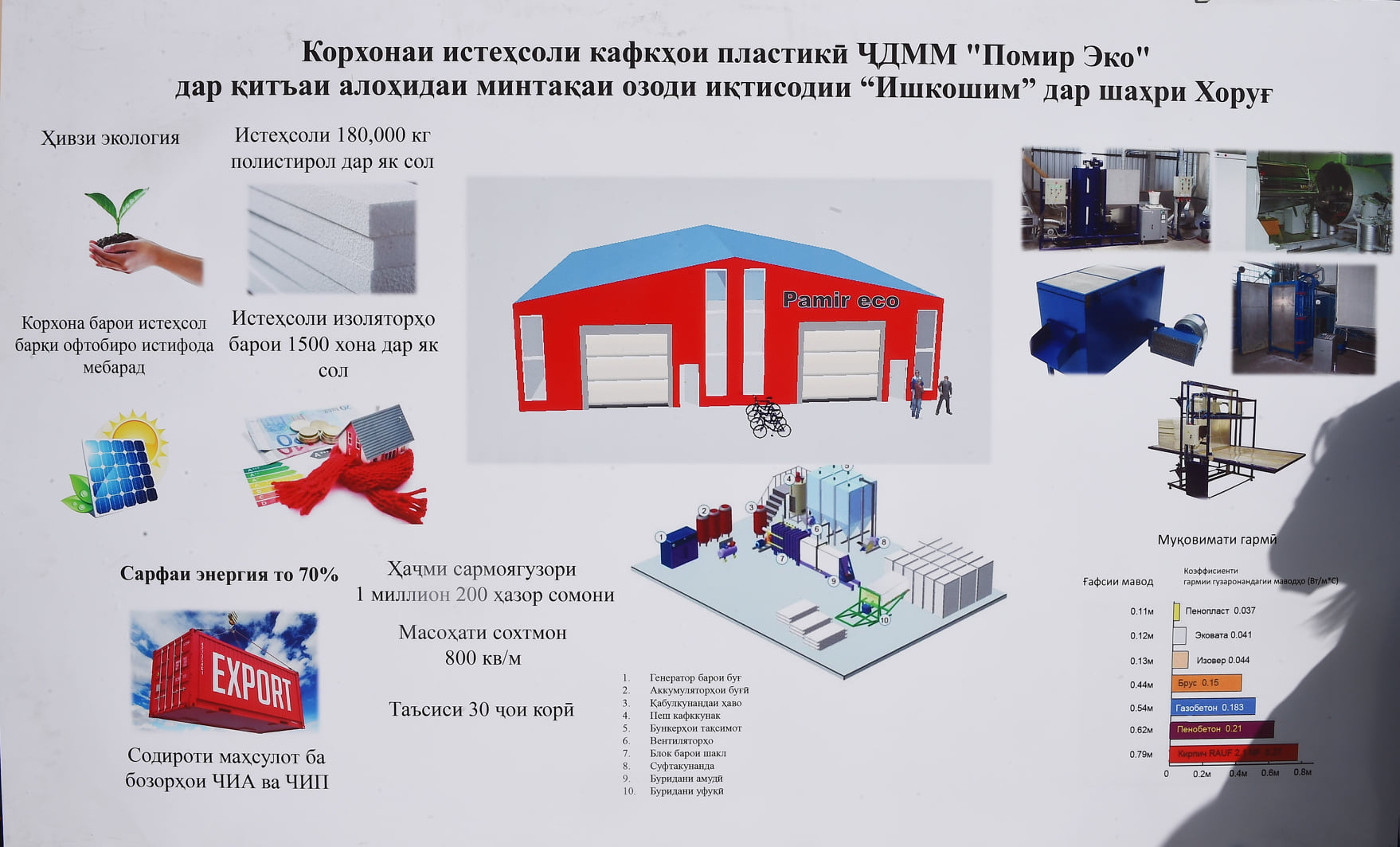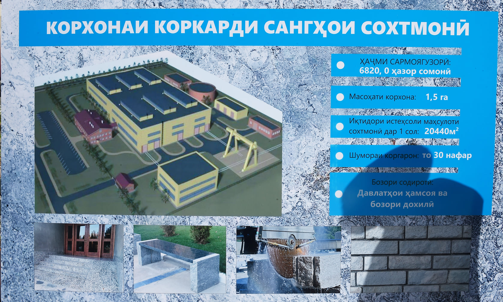 Здесь создадут предприятие по производству строительного и декоративного камня, цех по производству пенопласта, предприятие по производству теплоизоляционных материалов с использованием энергосберегающих технологий, предприятие по производству пластиковых труб, переработке фруктов и цех по производству металлических конструкций.