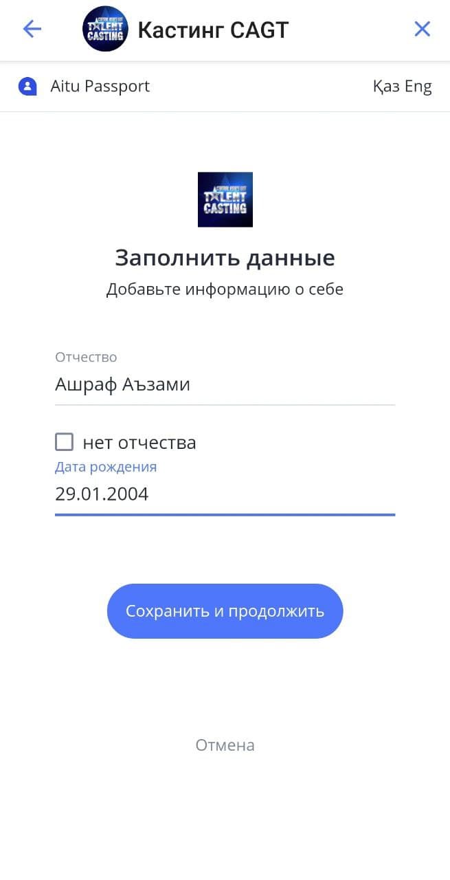 Шаг 5: Вы выбрали язык. Отлично! Вы начали процесс заявки на пре-кастинг. Первым делом вы введите свои персональные данные: ФИО и дату рождения