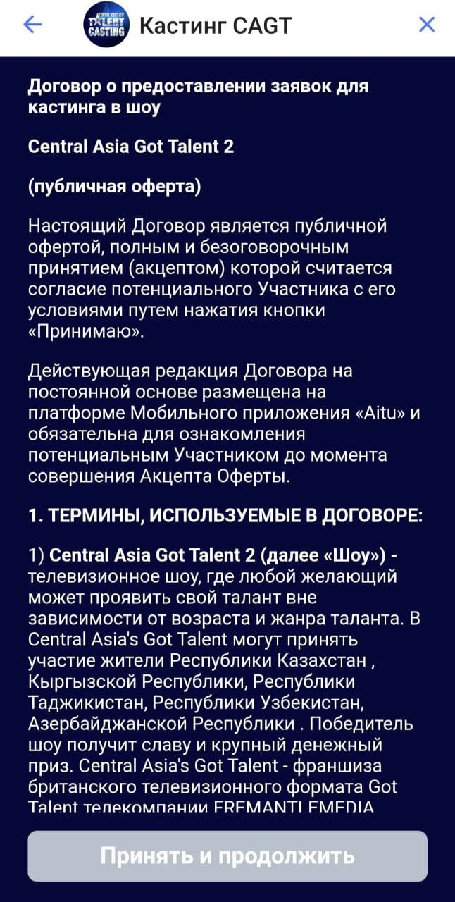 Шаг 6: Прочитайте внимательно оферту заявки. Там находится вся необходимая информация о правах и обязанностях участника шоу, а также подробная информация о критериях вашей заявки. Если вы прочитали и все еще хотите участвовать, то нажмите на кнопку “Принять и продолжить”.