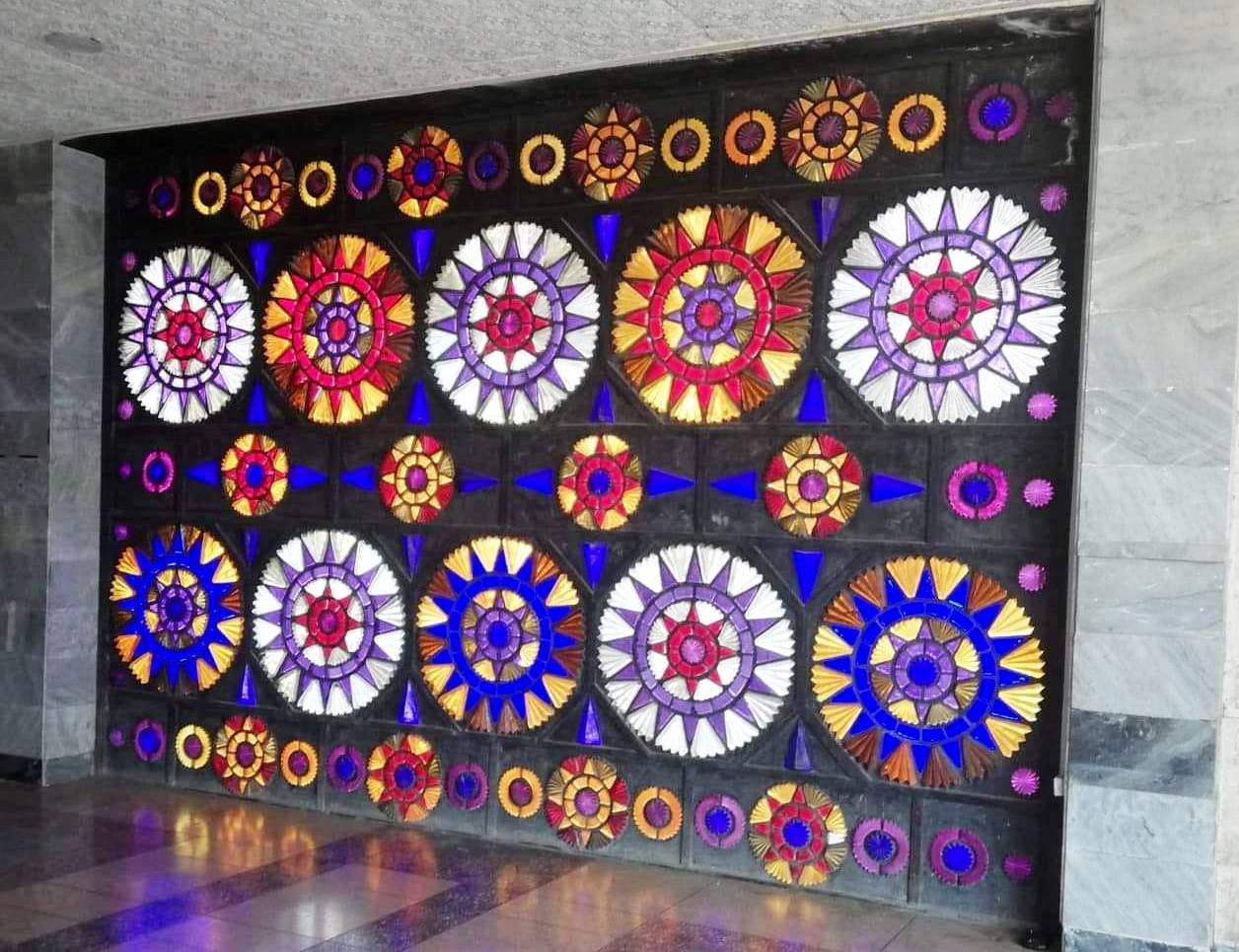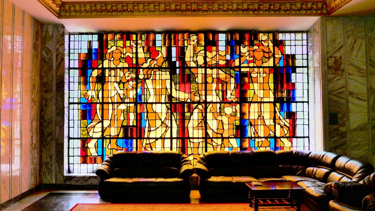 10 Витраж «Люди солнца» тонкое цветное стекло. Проходная душанбинского хлопчатобумажного объединения. Автор Носирбек Нарзибеков.