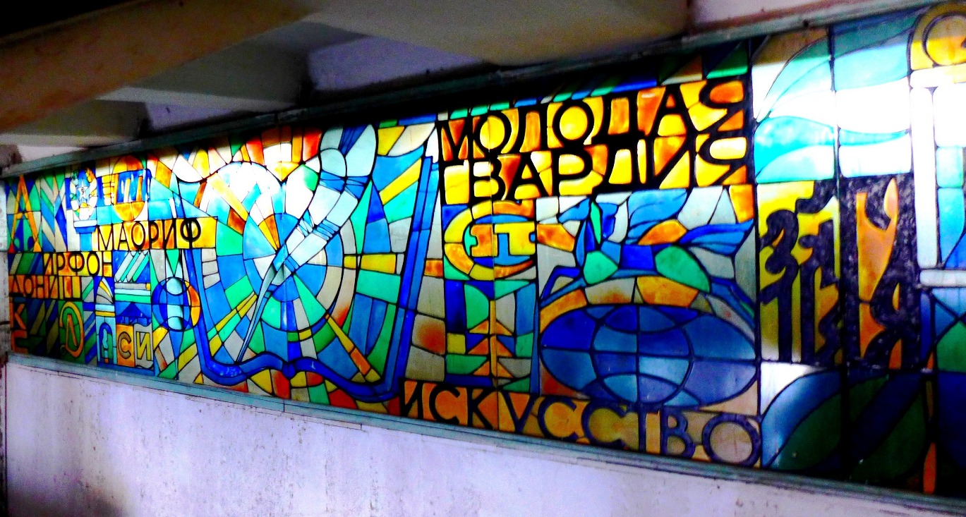 Витраж. Литое стекло. Вестибюль нового корпуса Таджикского Национального университета, 1982 год. Автор Евгений Просмушкин.