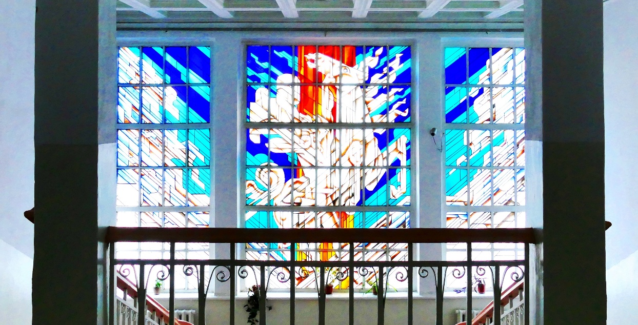 Витраж из цветного стекла, межэтажный проход Национального агентства "Дом книги Таджикистана". Автор Евгений Просмушкин.