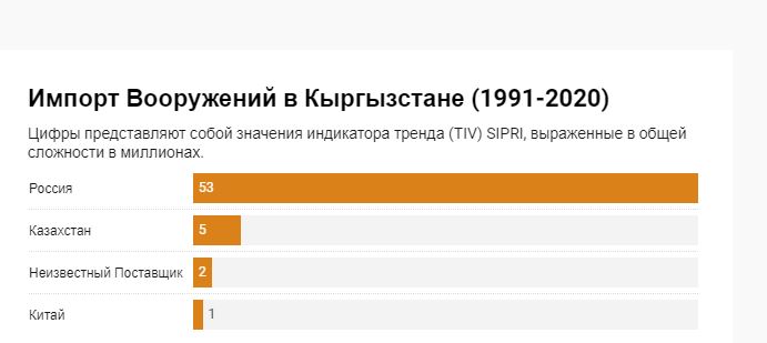 Кыргызстан имеет три стабильных поставщика вооружений, где Россия возглавляет список со значением (TIV) 53, а Казахстан и Китай по 5 и 1 соответственно.
