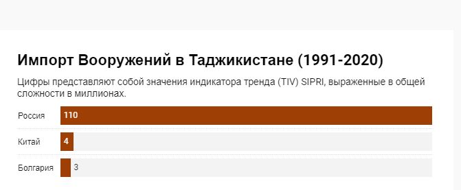 На таблице ниже, можно увидеть, что Таджикистан получает импорт вооружений из весьма ограниченного количества стран. России принадлежит 110 (TIV), в то время как у Китая всего лишь 4 (TIV) и у Болгарии 3 (TIV) начиная с 1991 года. Как видно, Россия лидирует в импорте вооружений Таджикистана и Кыргызстана с 1991 года. Российский учёный, политолог и востоковед Василий Кашин утверждает, что «это главным образом связано с тем, что страны являются членами ОДКБ, получают российское вооружение по значительно сниженным ценам».