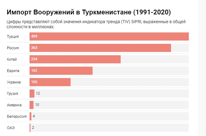 Вопреки ожиданиям лидерства России, Турция вырывается вперед в списке импортеров вооружения в Туркменистане – 46 (TIV). Кроме того, поставщиками вооружений в Туркменистан являются страны как Россия, Китай, Украина, Европа и другие.
