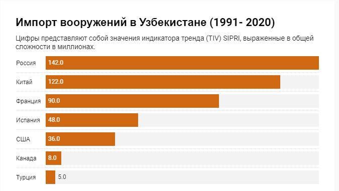 Хотя Россия все еще лидирует по поставкам вооружения в Узбекистан, Китай также не отстает от России с разницей по поставкам в 20 (TIV). Франция, Испания и США также импортирует вооружения Узбекистану, хоть и в незначительном количестве по сравнению с вышеупомянутыми странами.
