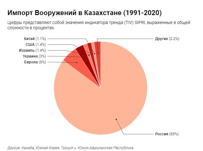 Данные по Казахстану иллюстрируют наиболее диверсифицированный список поставщиков, куда входят страны как Канада, Южная Корея, Турция, Израиль и Украина и многие другие. России принадлежит 85% всего импорта. Европейские страны занимают второе место с 6%, после чего следует Украина 3%. США и Израиль смогли поставить Казахстану вооружения на 1.3% каждый. Самую меньшую долю составляет Китай, который поставил суммарно 1.1% вооружений с 1991 года.