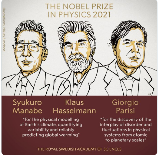 Лауреатами Нобелевской премии по физике 2021 года стали Джорджо Паризи за открытие взаимодействия между беспорядком и флуктуациями в физических системах (от атомных до планетарных масштабов), а также Сюкуро Манабе и Клаус Хассельман — за физическое моделирование климата Земли, количественной оценки его изменчивости и надежного прогнозирования глобального потепления, пишет dw.com.