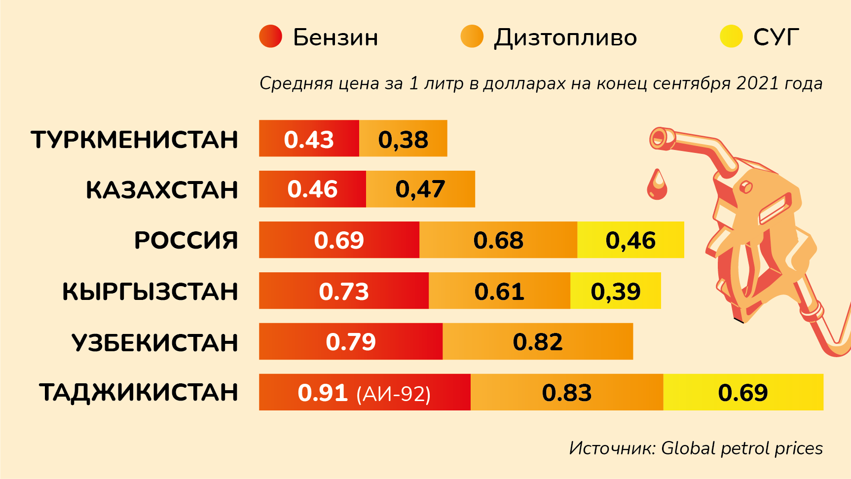 Сравнили цены на бензин, дизтопливо и сжиженный (углеводородный) газ. В Таджикистане заправлять и жить дороже чем во всех других стран ЦА, да и России тоже.