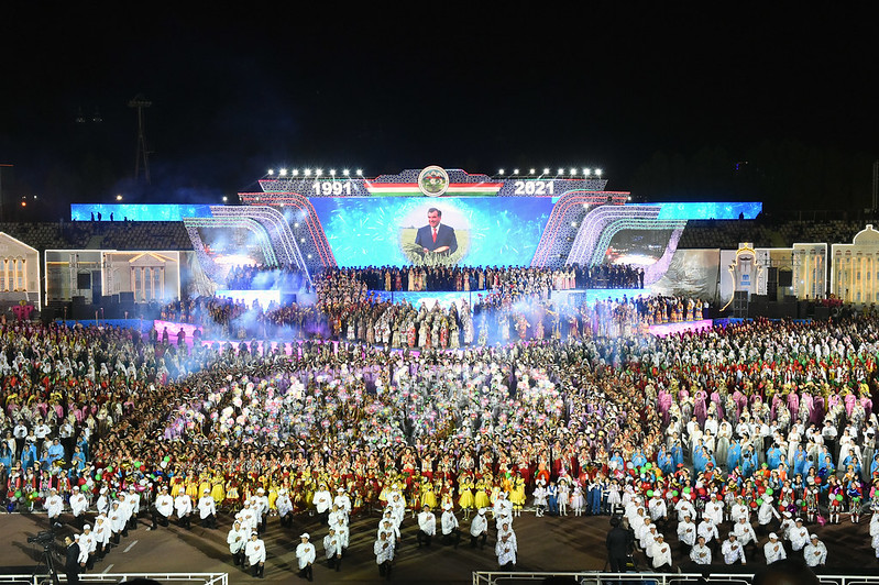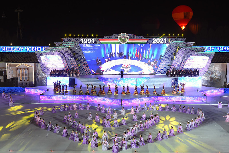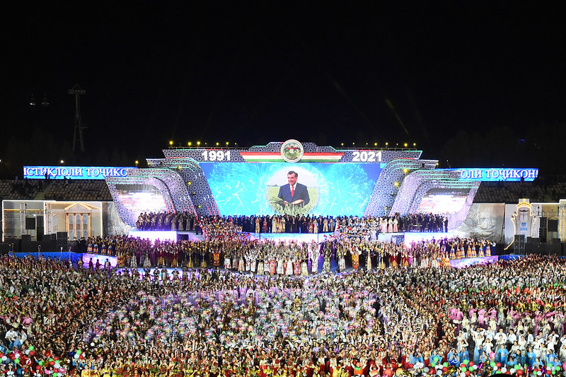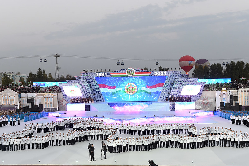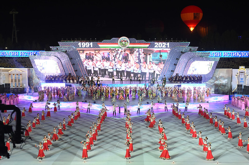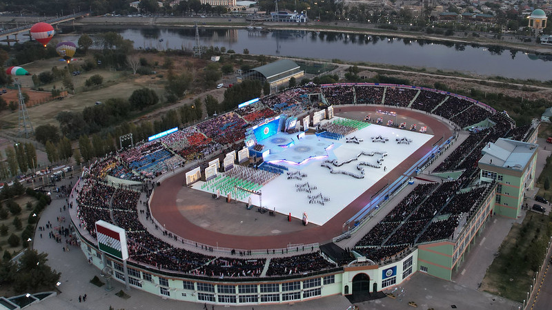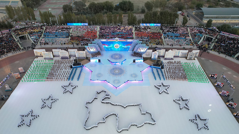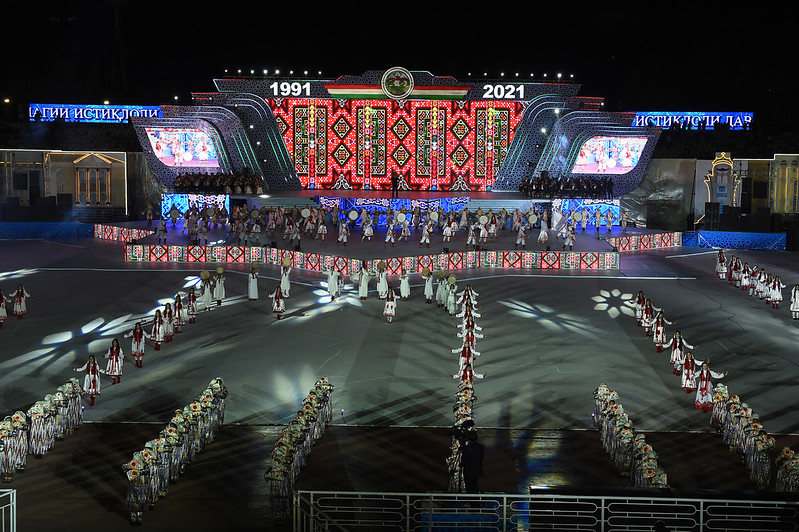 После выступления главы государства на стадионе прошло театрализованное представление, посвященное 30-летию независимости страны и достижениям Согдийской области.