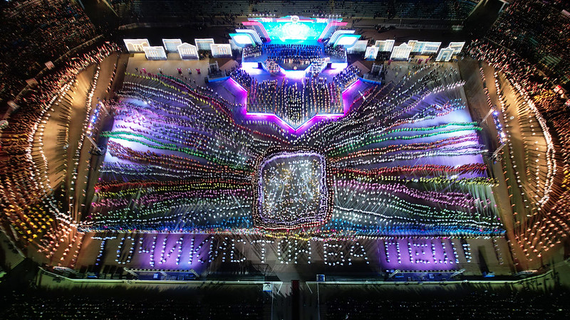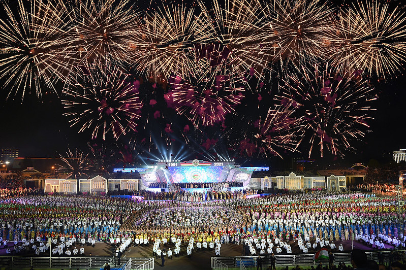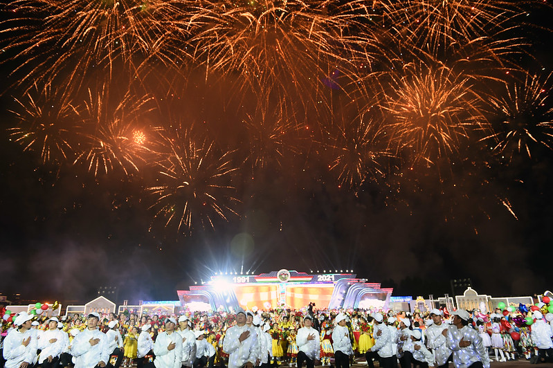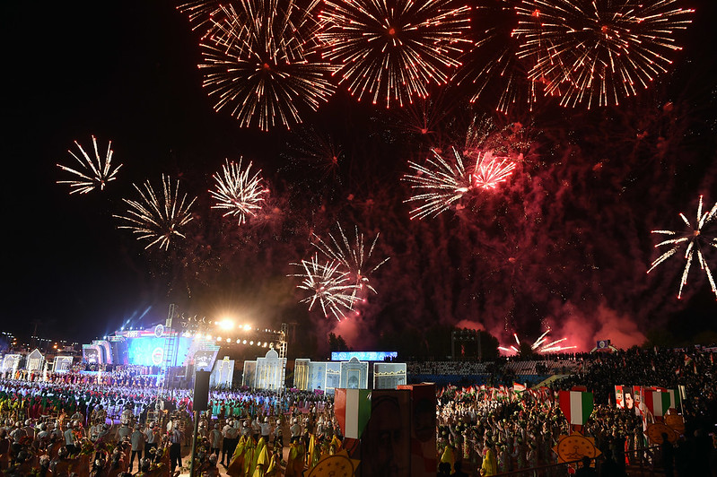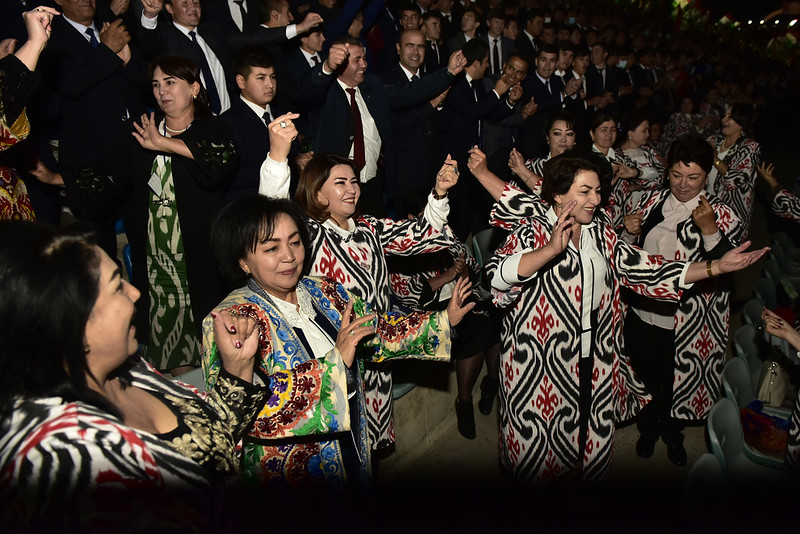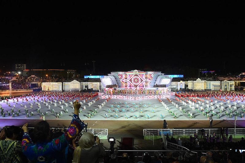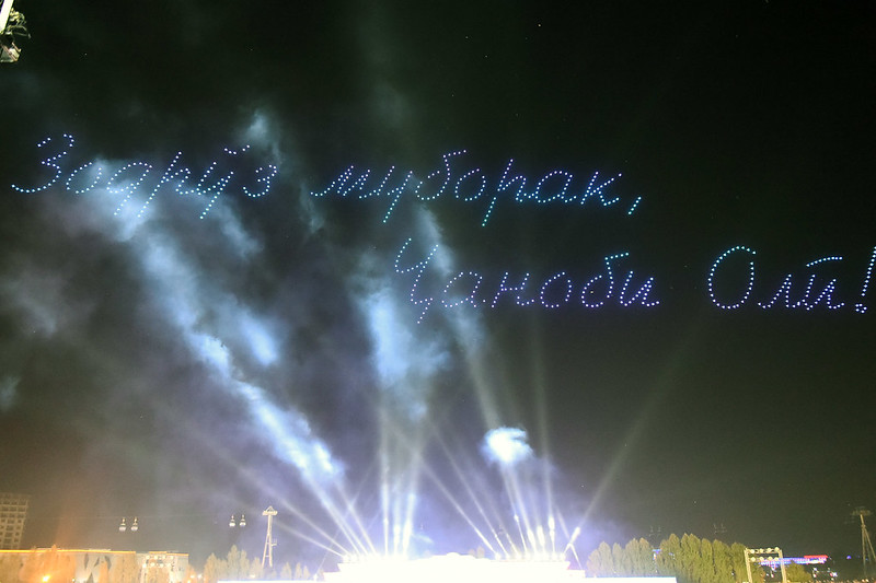 После выступления главы государства на стадионе прошло театрализованное представление, посвященное 30-летию независимости страны и достижениям Согдийской области.