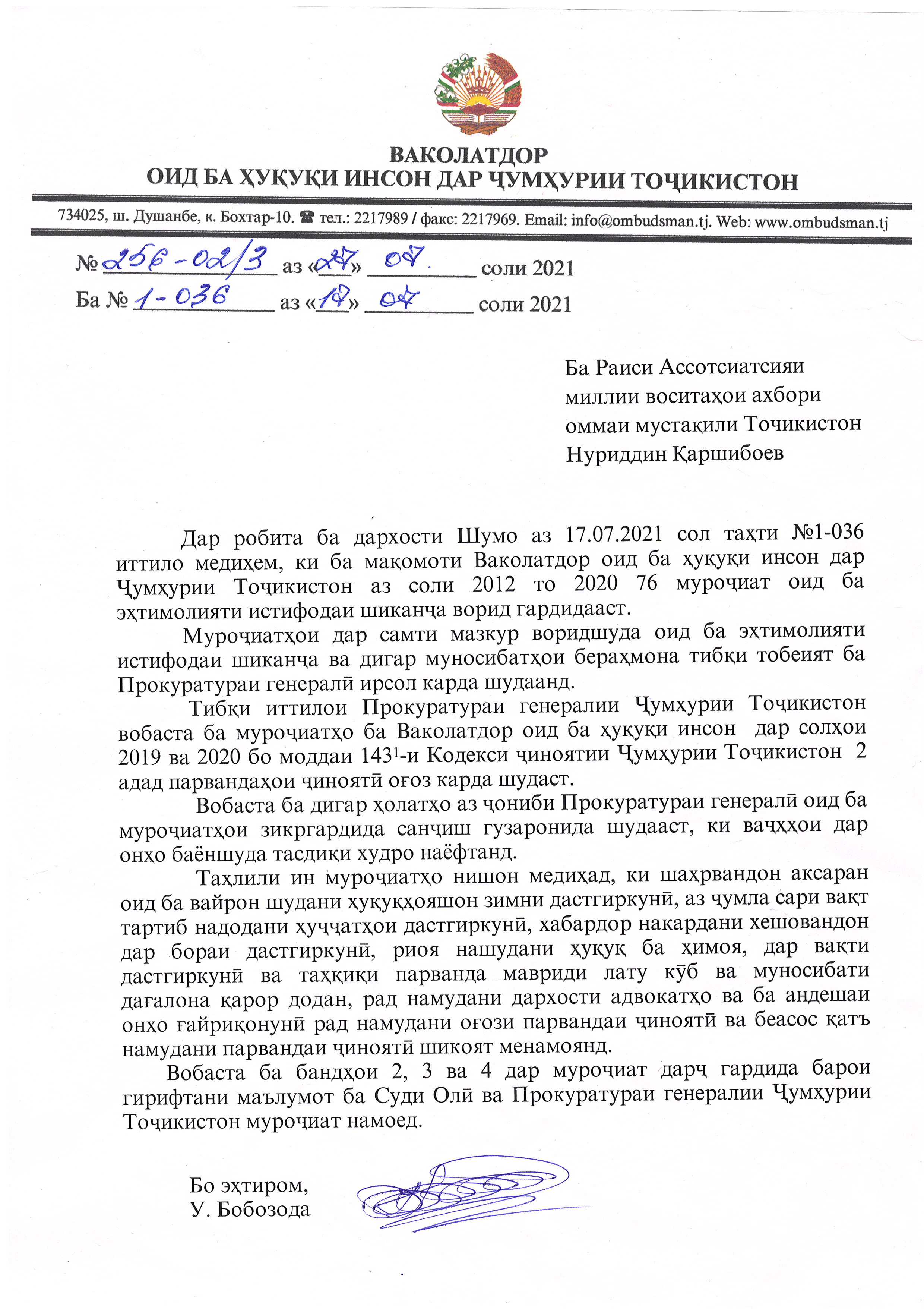«По случаю получения телесных повреждений и смерти Бободжонова Умарджона было возбуждено уголовное дело по статье 110, ч.3, пункта “в” Уголовного кодекса Таджикистана (умышленное причинение тяжких телесных повреждений). Но в соответствии с требованиями Уголовно-процессуального кодекса Республики Таджикистан расследование уголовного дела приостановлено».