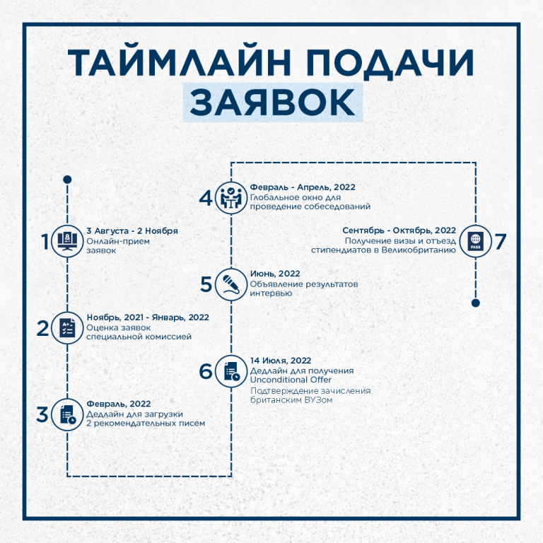 По согласованию с Посольством Великобритании, определенное количество полуфиналистов будут приглашены на интервью где-то между февралем и апрелем 2022 года. Именно в эти три месяца открыто глобальное окно для интервью лучших кандидатов.