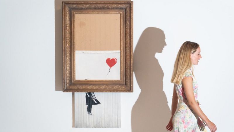 Поначалу эта картина называлась "Девочка с воздушным шаром", но после того, как на аукционе Sotheby's в Лондоне в октябре 2018 года часть картины разрезалась на мелкие полоски хитро спрятанным в рамке шредером, ее переименовали в "Любовь в мусорном баке".