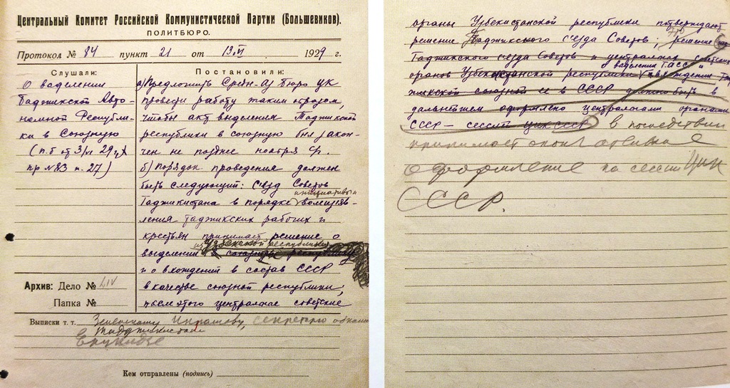 13 июля 1929 года правительство Узбекской ССР одобрило постановление правительства СССР и образовало комиссию по проработке всех вопросов о выходе Таджикской АССР из состава Узбекской ССР и преобразовании ее в Союзную республику.
