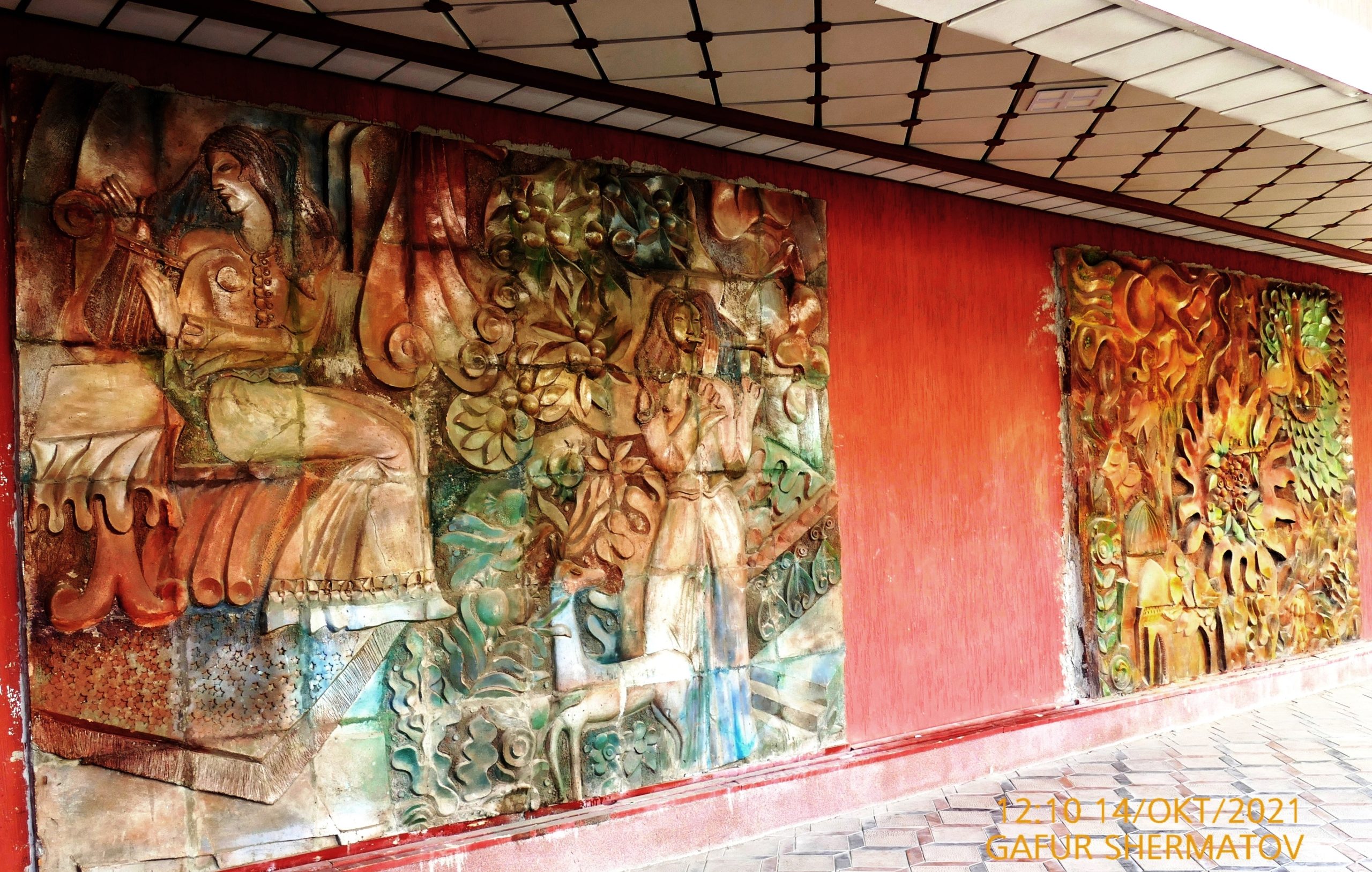 Совсем недавно мой хороший знакомый — заместитель министра культуры Таджикистана Шарифзода Манучехр Муртазо сообщил мне новость, которая меня очень обрадовала — четыре керамических панно, ранее демонтированных с фасада снесенного дома на Рудаки, 66 (в советские годы на первом этаже этого здания располагался знаменитый магазин детских игрушек «Сказка»), устанавливаются на фасаде здания республиканского художественного колледжа им. М. Олимова.