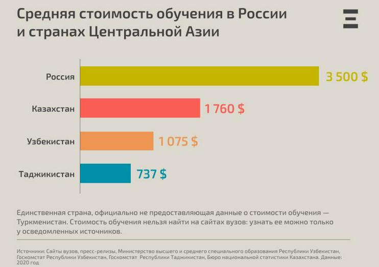 По сравнению с Россией, в вузах Центральной Азии учиться недорого. Средняя стоимость обучения в российском вузе — около 250 000 рублей в год ($3500), что в несколько раз выше, чем в вузах Казахстана, Узбекистана, Таджикистана и Туркменистана. Однако, по словам студентов из Туркменистана и Таджикистана, к стоимости обучения у них на родине также могут добавляться взятки для поступления и сдачи экзаменов.