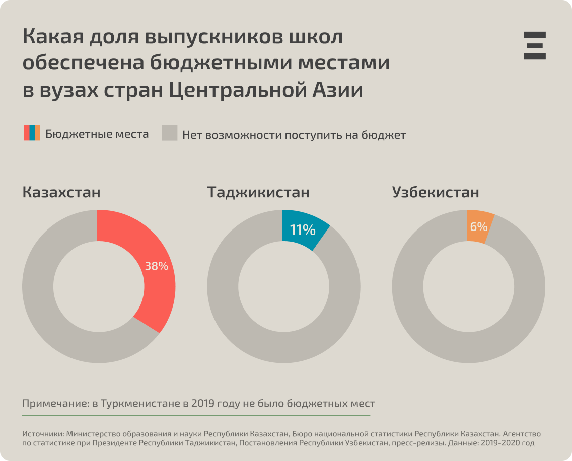 Во всех странах Центральной Азии, за исключением Туркменистана в 2019 году, когда высшее образование стало платным, часть мест в вузах финансируется государством. Однако из-за дефицита бюджетных мест создается слишком высокий конкурс, что становится одной из причин для получения образования за границей, где условия для поступления проще.