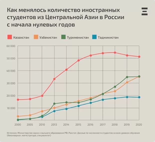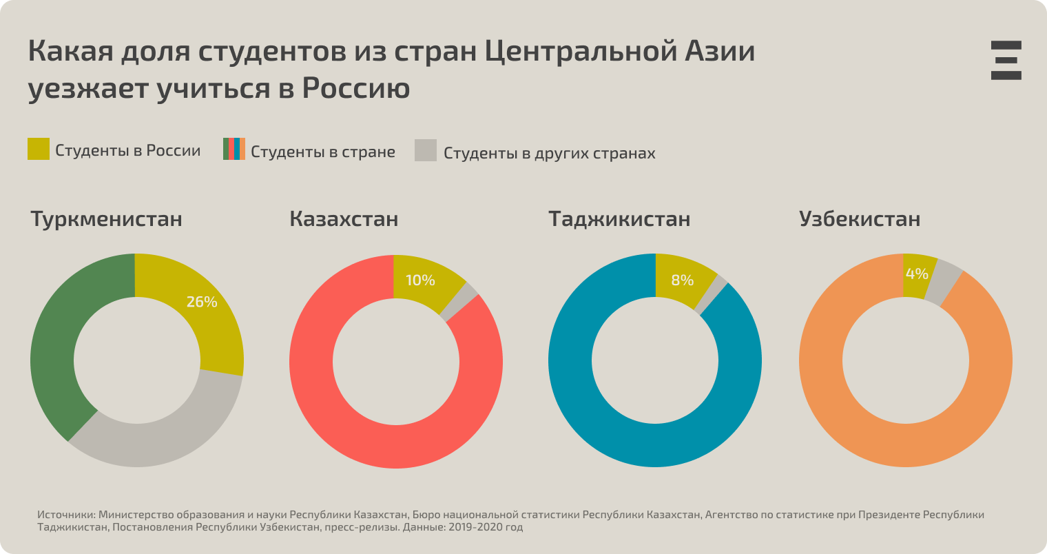 Россия входит в топ-10 стран по количеству иностранных студентов. При этом почти половина из них приезжает в российские вузы всего из четырех центральноазиатских республик — Узбекистана, Казахстана, Таджикистана и Туркменистана. В новом дата-исследовании молодежный интернет-журнал DOXA разбирается, почему абитуриенты из этих стран выбирают именно Россию для получения высшего образования.