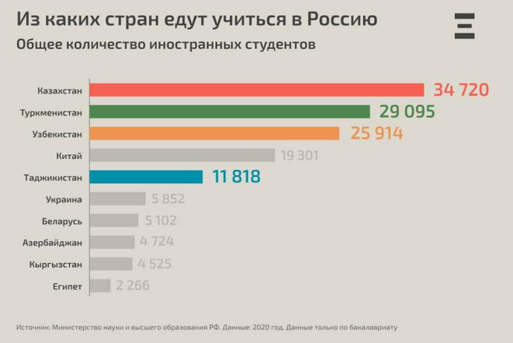 В российские вузы приезжают учиться как из стран СНГ, так и из дальнего зарубежья — в десятку, помимо бывших советских республик, входят Китай и Египет. Но почти каждый второй студент, приехавший учиться в Россию — гражданин Казахстана, Узбекистана, Туркменистана или Таджикистана. Они составляют 47% от общего числа иностранных студентов.