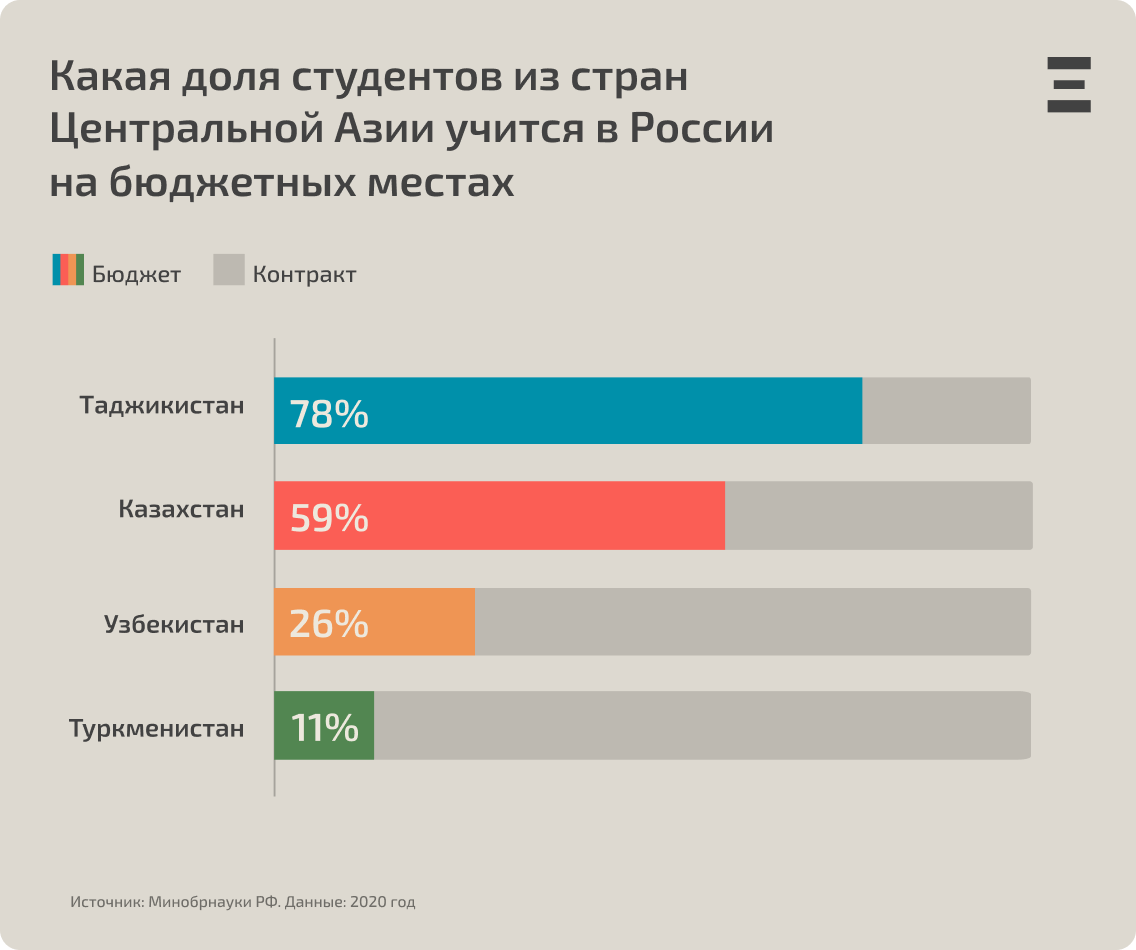 В России у иностранных студентов есть возможность учиться за счет российского бюджета. Подавляющее большинство студентов из Таджикистана учатся в российских вузах бесплатно, как и более половины приехавших из Казахстана. При этом только каждый четвертый узбекистанец и каждый десятый туркменистанец получают такую возможность — в основном граждане из этих стран получают образование в России за свой счет.