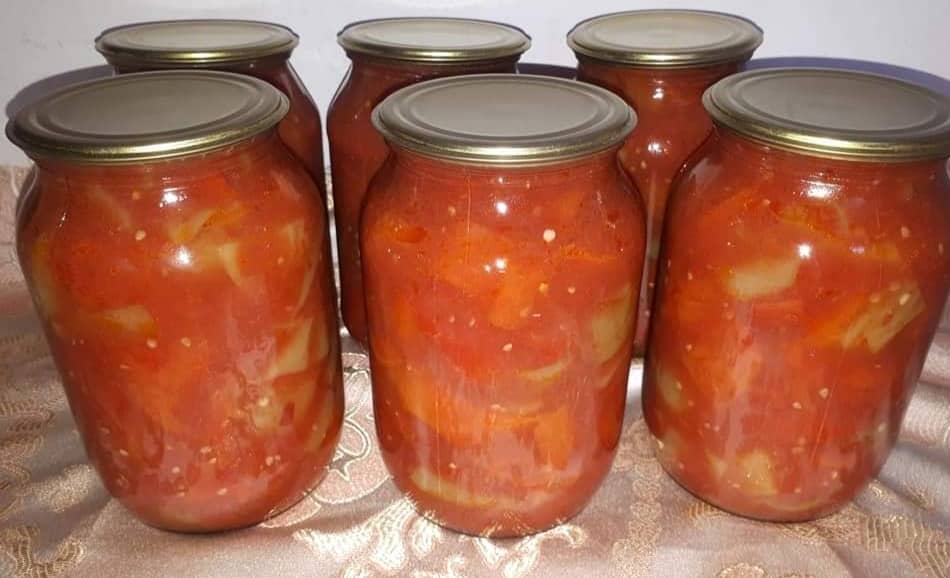 После приготовления салат в горячем виде раскладывается по банкам, и туда же равномерно разливается весь выделившийся сок салата.