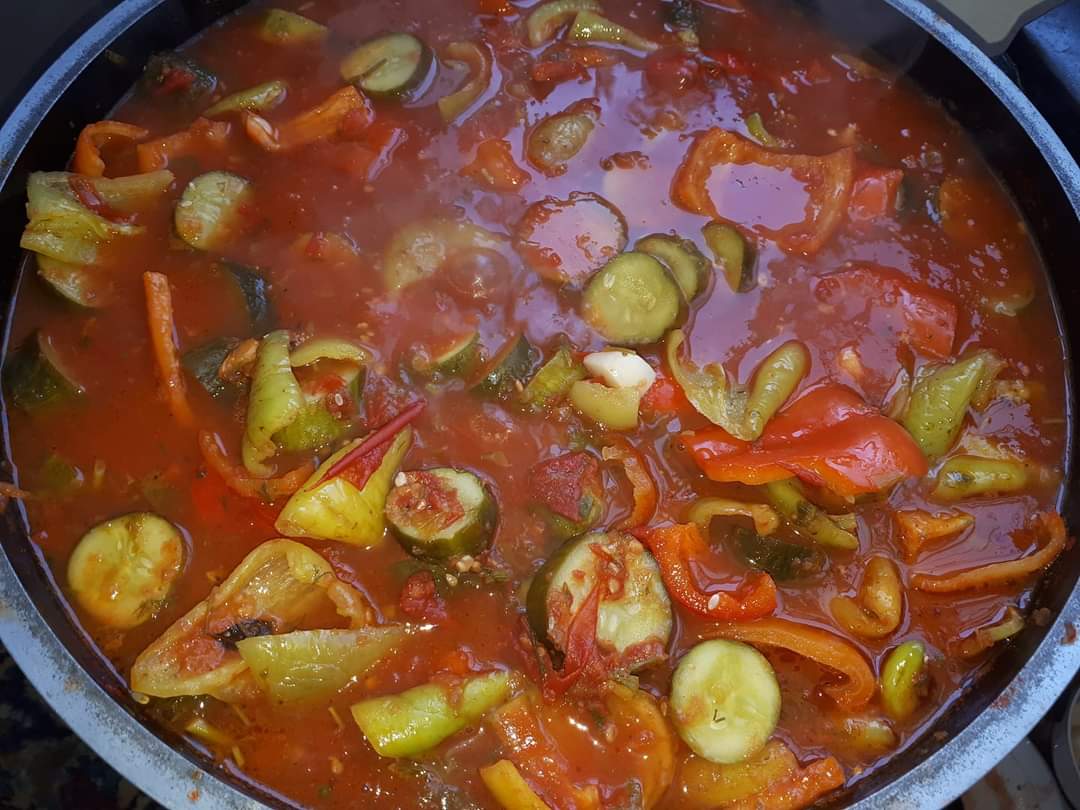 Сначала делаем поджарку из лука и моркови, после этого по очереди добавляются овощи, специи, и все остальные ингредиенты и тушатся. После этого кипящую массу раскладываем по банкам, и кутаем до полного остывания.