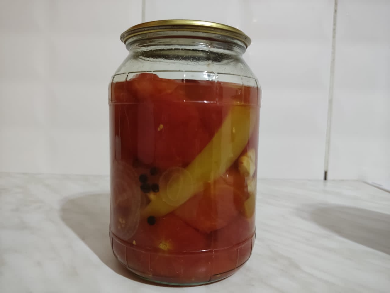 В эту закрутку входят отборные помидоры среднего размера, чёрный душистый перец, репчатый лук, болгарский перец, соль и специи.